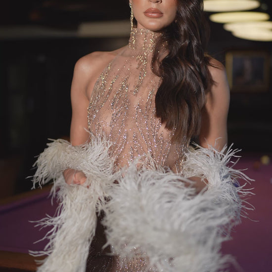 Crafted to captivate, the Martini Dress in Gold is a true after-dark statement. Designed in sheer embellished fabric with a sculpting fit, high neckline, and open back — the intricate gold beading catches the light from every angle.